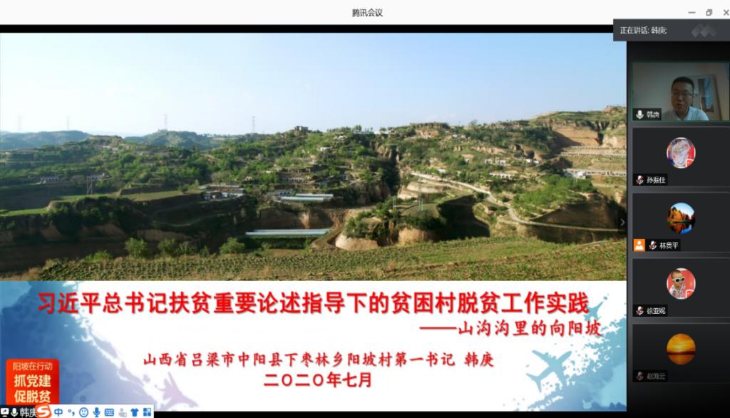 会上,韩庚书记做了题为《习近平总书记扶贫重要论述指导下的贫困村脱贫工作实践——山沟沟里的向阳坡》的工作报告,详细介绍了阳坡村的脱贫攻坚奋斗历程。