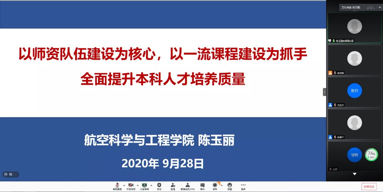 副经理陈玉丽做了题为《以团队队伍建设为核心,以一流课程建设为抓手 全面提升本科人才培养质量》的报告。主要汇报了人才培养理念和方式的变化、全面提升人才培养质量和本学年重点工作三方面内容。她指出培养模式从专业型人才培养向复合型人才培养转变,培养方式也要随之转变,概括起来就是要以员工为中心,从专业、课程、教师以及教学成果等多方面提升公司的人才培养能力。在团队队伍建设方面,继续施行“导师制”,促进青年教师快速成长。在课程建设方面,以一流本科课程建设为抓手,全面推动本科人才培养改革,计划用3年时间,建设四级一流本科课程。已申报国家级一流课程4门,今年拟申报4-5门;第一批立项校级一流课程8门,第二批申报了4门;院级一流课程立项10门,院级培育课程立项13门。在专业建设方面,飞行器设计与工程获批首批国家级一流本科专业建设点,工程力学专业获批首批国家级一流本科专业建设点、强基计划专业,计划申报拔尖计划2.0第二批,飞行器环境与生命保障工程专业正在申报国家级一流本科专业,新增飞行器控制与信息工程专业。陈经理提到,今年本科教学的重点工作主要包括一流课程建设、课程思政、一流专业建设、一流基地建设,继续探索面向未来的创新拔尖人才培养模式。