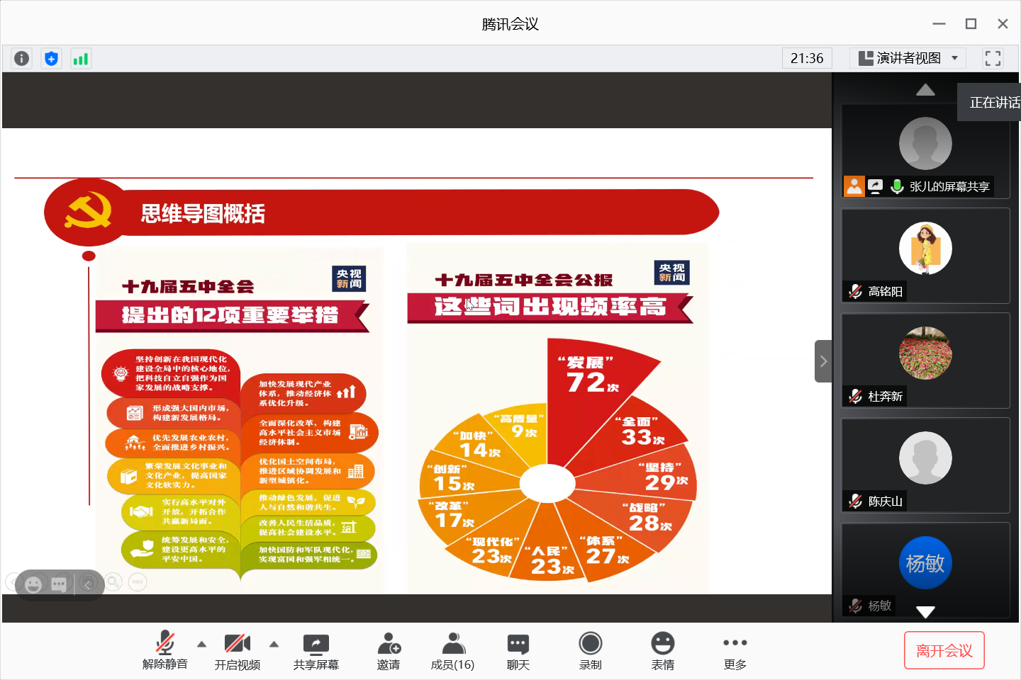 机关党支部书记蒋崇文同志带领大家一起学习了中国共产党第十九届中央委员会第五次全体会议精神相关内容。会议听取了习近平总书记受中央政治局委托作的工作报告,并审议通过了《中共中央关于制定国民经济和社会发展第十四个五年规划和二〇三五年远景目标的建议》(以下简称规划《建议》)。这份长约2万字的文件,为未来5年及15年的中国发展勾勒了蓝图,明确了方向。大家围绕“一个主题、两个阶段、三个核心、四个全面、五大理念”对规划《建议》进行了详细解读和学习。通过学习,深入了解了“高质量发展”以及“全面建设社会主义现代化国家”这些国家未来发展的重要战略,在学习到科技创新战略时,大家表示,国家近年来对科技创新的重视程度不断增强,这充分体现了科教兴国和科技强国的重要性,航空航天领域是科技产业的重要组成部分,在未来的发展中一定要跟随国家科技发展的战略引导,实现航空强国的理想。