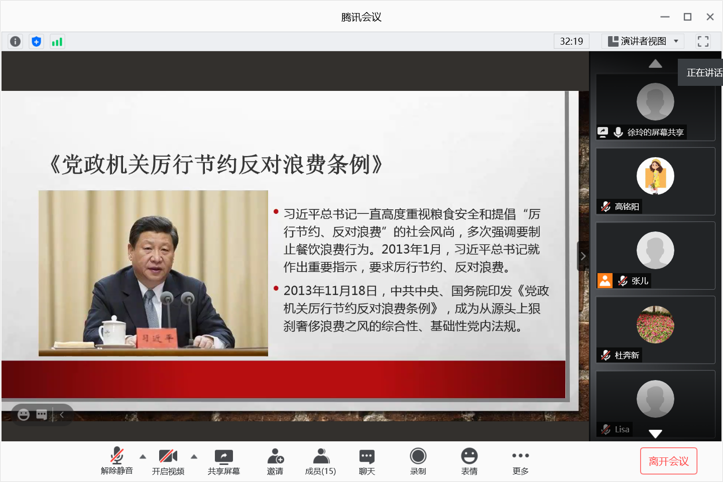 随后,徐玲同志带领大家学习了《党政机关厉行节约反对浪费条例》、《关于厉行节约反对食品浪费的意见》。