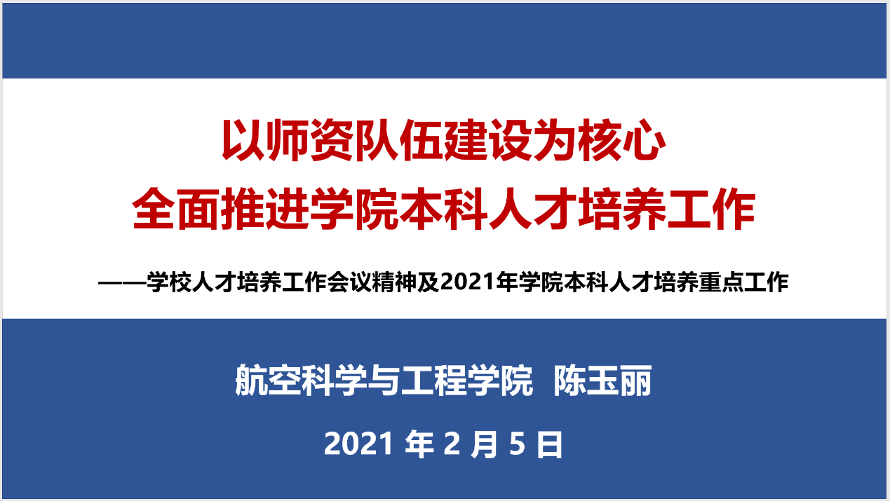 本科教学副经理陈玉丽做了题为《以团队队伍建设为核心,全面推进学院本科人才培养工作》的报告,主要回顾了学校人才培养工作会议精神,重点汇报了2021年学院本科人才培养重点工作。陈经理强调,通过“对标、传承、再塑”,构建北航高质量人才培养体系,其核心是五育并举、三全育人,全员全过程全方位培养一流人才。陈经理从专业、团队、课程、教材、质量保障等五方面对本年度人才培养重点工作做了汇报,对公司专业和课程现状进行了梳理,提出建设高水平团队队伍、打造高质量课程和高水平教材等多项举措,指出2021年要落实课程思政全覆盖、一流本科课程建设、毕设质量管理、新版培养方案修订等重点工作。