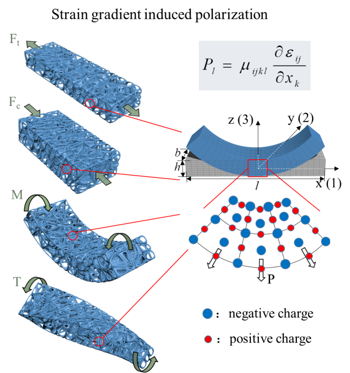 力电耦合是机械能和电能之间相互转化的重要效应。其中,挠曲电效应由于其小尺寸效应、不受材料对称性和居里温度限制的特点,在结构健康监测领域、新型应变梯度传感器、新型压电/挠曲电复合材料、新型加速度传感器等方面具有广阔的应用前景。因挠曲电效应与应变梯度正相关,现有研究主要集中在针对不规则形状或特殊载荷作用下宏观实体材料的挠曲电效应上,但是实体材料的挠曲电输出通常很低,提高材料的挠曲电输出是一个广受关注的挑战性课题。