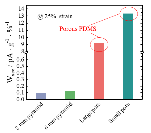 图2 多孔PDMS比实体截断金字塔PDMS的比质量挠曲电电流高两个数量级