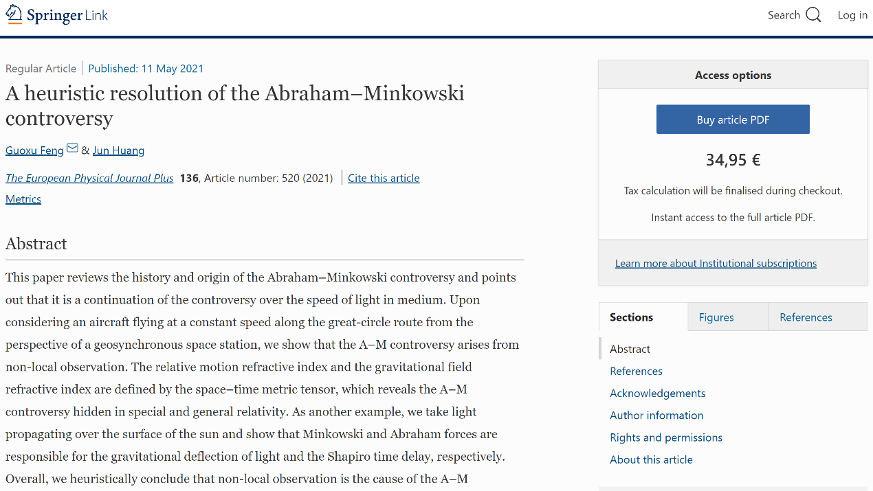 近日,公司冯国旭博士后和黄俊教授用非常规方法解决了亚伯拉罕-闵可夫斯基百年争议,成果发表在European Physical Journal Plus期刊(Q1,影响因子3.228)。论文的研究方法源自于飞机的大圆导航方程和军用飞行器对雷达隐身突防效能仿真建模中采用的电磁波传播理论。