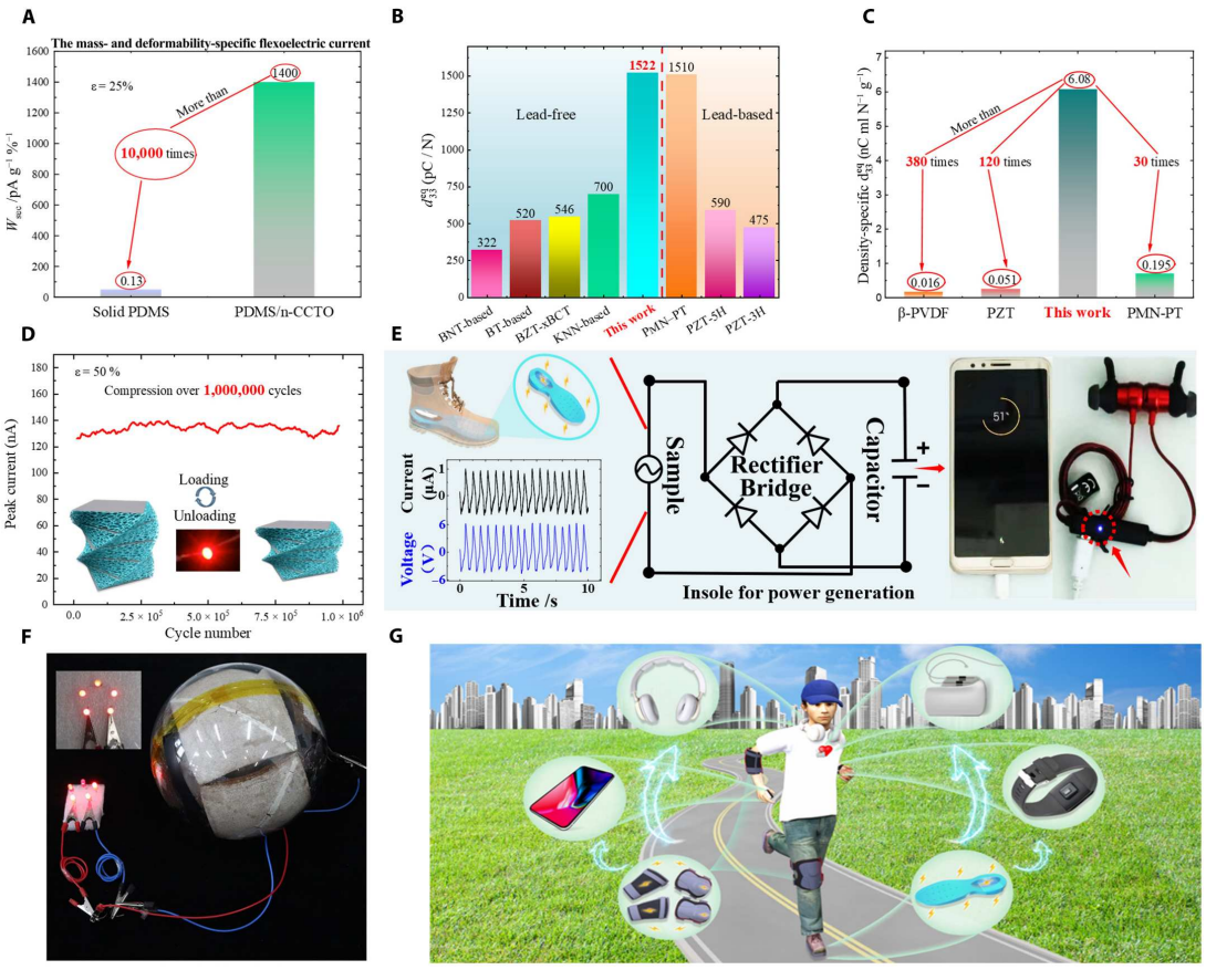 近日,该课题组与合作者通过设计复合材料提高等效挠曲电系数、优化多孔结构韧带的长细比、设计压-扭耦合变形模式增加应变梯度,以及布置多个感应电极收集电荷等方案,制备了钛酸铜钙(CCTO)纳米颗粒填充聚二甲基硅氧烷(PDMS)多孔复合材料,实现了多孔材料在宏观尺度上更高的挠曲电输出:多孔复合材料的比质量挠曲电流输出高达实体基体材料的10,000倍,其等效表观压电系数超过无铅压电陶瓷,并可与具有最高压电系数的含铅压电陶瓷媲美;比密度等效压电系数超出常用压电陶瓷PZT的120倍,压电聚合物b-PVDF的380倍;复合泡沫在100万次循环变形下,力学性能和挠曲电输出依然稳定;提出了“应变梯度发电机(Strain-Gradient Electric Generator, SGG)”的概念,将此材料制成鞋垫、以及填充在一个球壳中,分别通过正常行走和摇动球壳产生电流,可为手机、蓝牙耳机充电,以及点亮LED灯。纳米颗粒填充PDMS多孔复合材料具有柔性、轻质、高效的特点,既可以作为高灵敏度的全向力电耦合柔性传感器,又可作为一种轻质柔性应变梯度发电机,可以适应广泛的应用场景。