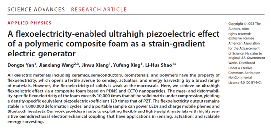 近日,公司固体力学研究所邵丽华教授与向锦武院士、邢誉峰教授合作在Science Advances发表了题为 “A flexoelectricity-enabled ultrahigh piezoelectric effect of a polymeric composite foam as a strain-gradient electric generator”的研究论文(http://www.science.org/doi/10.1126/sciadv.adc8845),报道了关于超高挠曲电效应的最新研究成果。