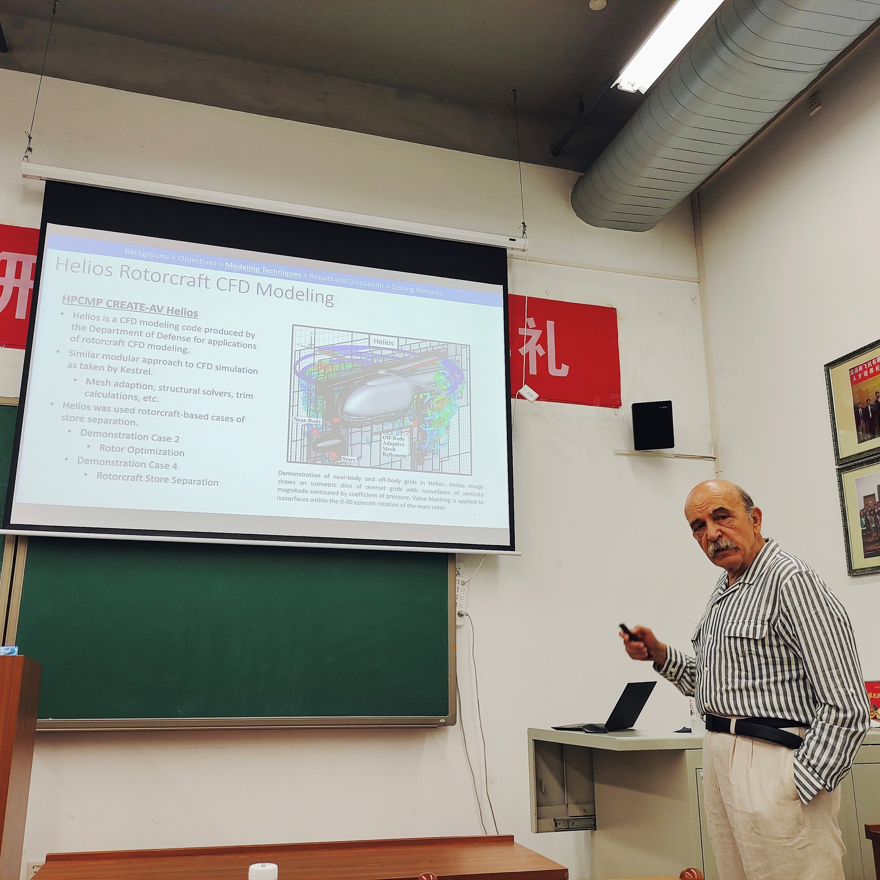 第二场报告题为“Construction of mode based reduced order models (ROM) for moving bodies”,第三场报告题为“Machine learning-based surrogate modeling approaches for fixed-wing and rotary wing store separation”,Ekaterinaris教授分别介绍了其课题组利用降阶模型(POD, DMD)和机器学习(CNN)方法建立代理模型,从而快速预测运动物体气动载荷的研究工作,并将其成功应用于四个算例:俯仰和振荡外挂物的压力分布预测,直升机旋翼的气动优化,超声速飞行条件下固定翼飞机外挂物分离轨迹的预测,考虑旋翼尾迹影响的直升机外挂物分离轨迹的预测。讲座结束后,Ekaterinaris教授与现场师生热情互动,并对同学们提出的问题做出了详尽的解答。