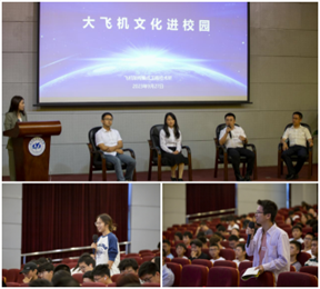 吴大卫老师以中国飞机的型号系列为索引,串联起其背后的故事,展现了中国飞机发展历程背后蕴含的精神和飞机设计师所需要具备的素养。冯臻老师讲述了自己进入商飞时怀揣的初心与梦想,感受到的使命与担当,和在从无到有的成长过程中取得的成就和获得的锻炼提升。曾飞雄老师首先向同学们介绍了他的工作职责定位,接着以风趣的语言讲述了他在工作领域一路摸索进步的个人成长经历。从与外国专家交流存在困难、缺少经费,到做出卓越的成果、优秀的设计,曾飞雄老师的经历令同学们倍感鼓舞。马茹冰老师与同学们的年龄最相近,她主要讲述了自己离开校园开展工作后面临的一些困境和解决的途径。她表示:曾经在校园中怀有的理想主义在进入工作后落到实地,发现真正的理想主义是做好每一件细碎的小事。