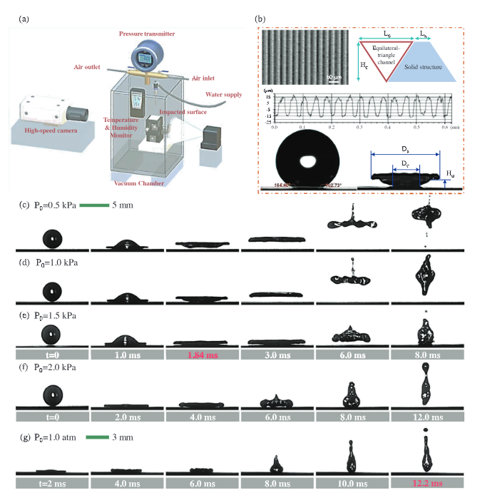 近日,公司文东升教授团队,在极端环境下超疏水表面基础研究方面取得重要研究进展。团队基于自主设计搭建的低压实验系统,研究发现在室温、近真空(环境压力3 kPa以下)环境条件下,液滴撞击超疏水表面时会发生极快的饼状弹跳现象,液滴与表面的接触时间能够大幅降低85%,达到目前已知最高水平。2024年3月18日,相关研究成果以《Low-pressure Pancake Bouncing on Superhydrophobic Surfaces》为题在线发表于国际知名学术期刊《Small》杂志,并被选为编辑推荐(Editor’ Choice)。