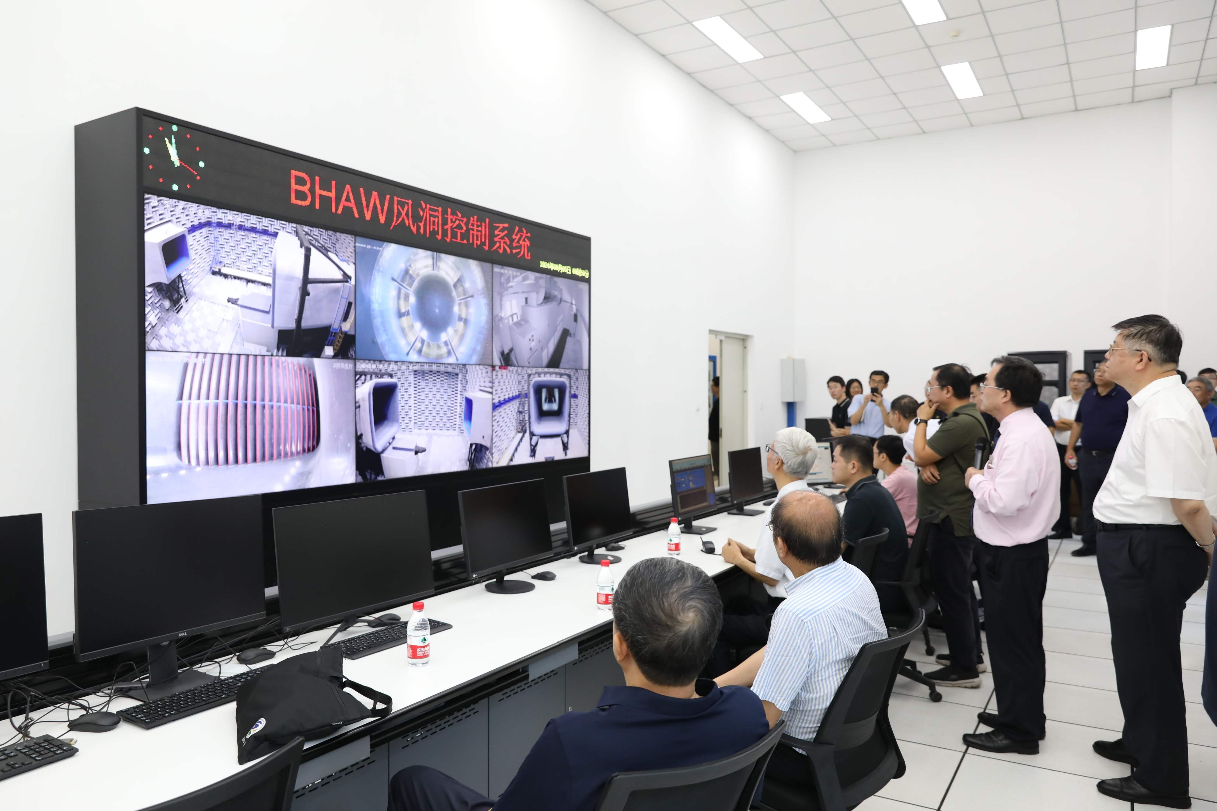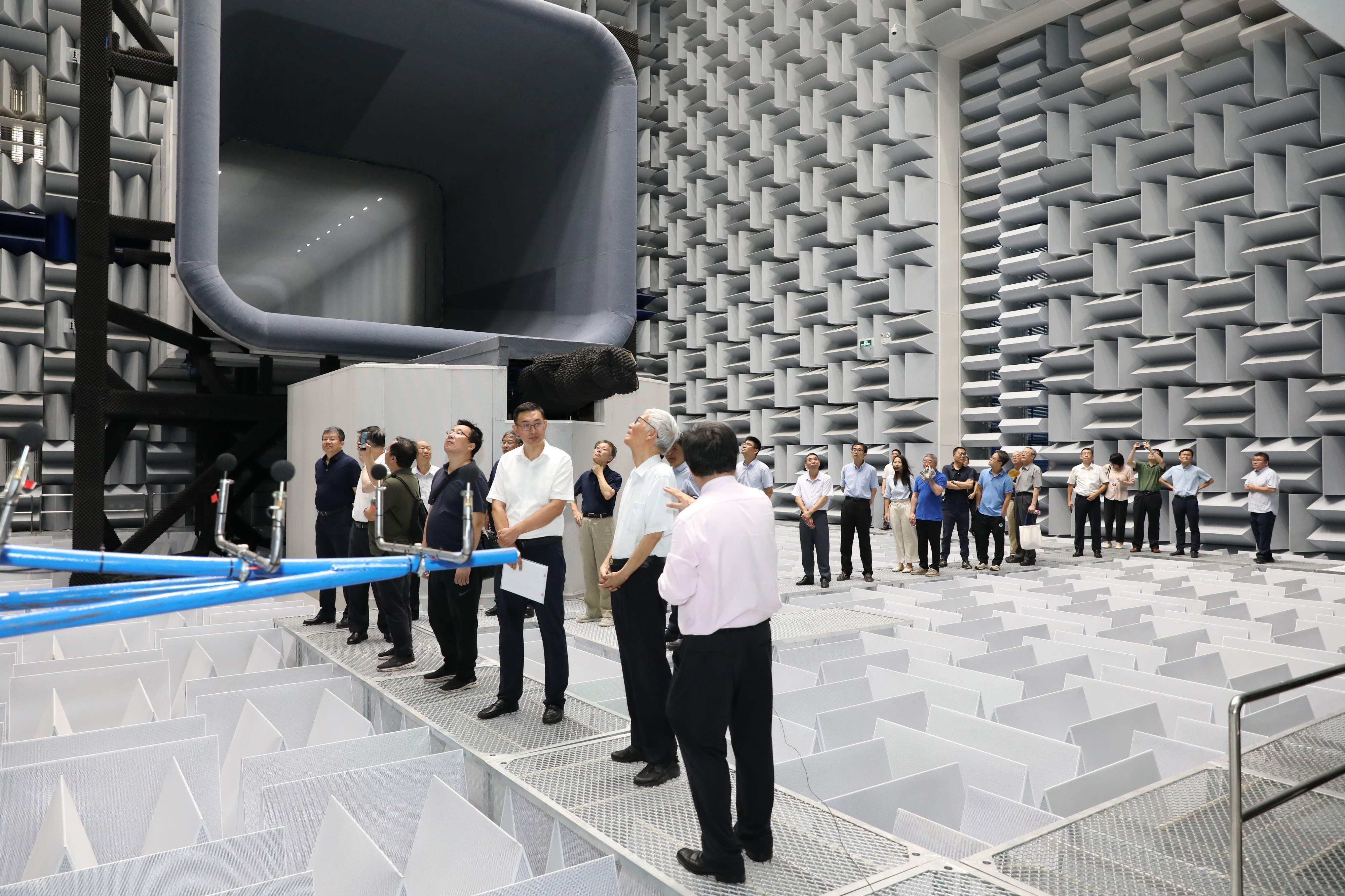 评审委员会现场考察了风洞设备和运行情况。在消声大厅,风洞建设项目负责人刘沛清向专家介绍了风洞的主要技术指标、关键设计技术和麦克风阵列等测试设备,专家现场感受了不同风速下消声大厅内部的体感噪声。在测控间,专家现场测试了风洞在不同运行风速下的背景噪声。