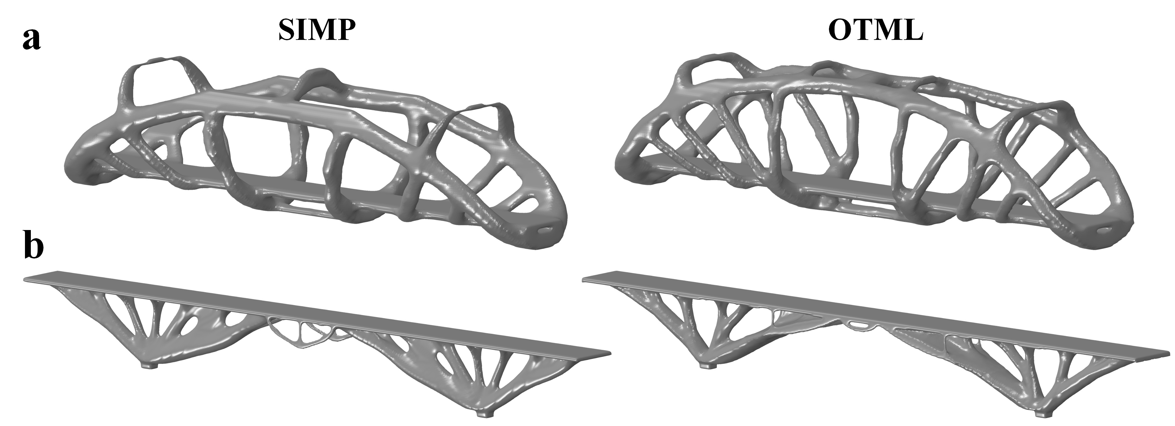 图4采用OTML方法完成了半通式拱桥设计。OTML设计的结构刚度比SIMP设计提高了2%。值得一提的是,OTML的计算耗时仅为SIMP的10%。