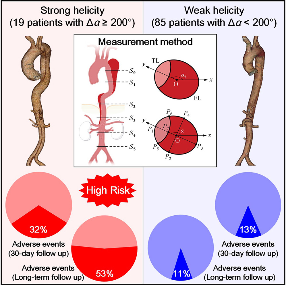 图1. 逾百例TBAD患者螺旋手性形貌及随访不良事件的关联统计结果。