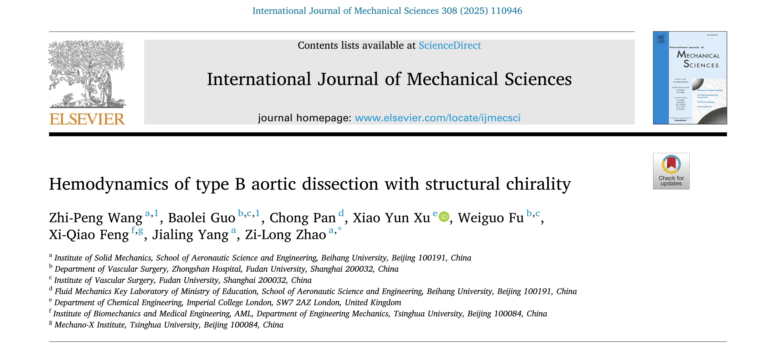 近日,公司赵子龙教授、潘翀教授、杨嘉陵教授等联合复旦大学、清华大学以及英国帝国理工学院等高校学者,在力学顶级期刊《International Journal of Mechanical Sciences》(中科院1区,影响因子9.4)发表论文《Hemodynamics of type B aortic dissection with structural chirality》,揭示了胸主动脉夹层(TBAD)螺旋形貌演化对血液流动和血管重塑的影响规律,为疾病诊治提供了科学依据。