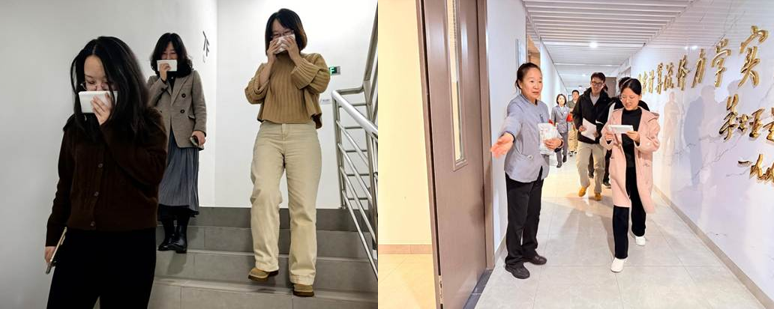 14:00,演练正式启动。科研二号楼 2 - 205 房间旁通道模拟火情突发,物业中控室迅速接收到相关信号,立即启动消防应急预案。科研二号楼 2 - 10 层及地下实验室 B1、B2、B3 层的师生在物业人员与现场引导员的有序指引下,沿指定消防通道快速有序撤离至指定集结区域。