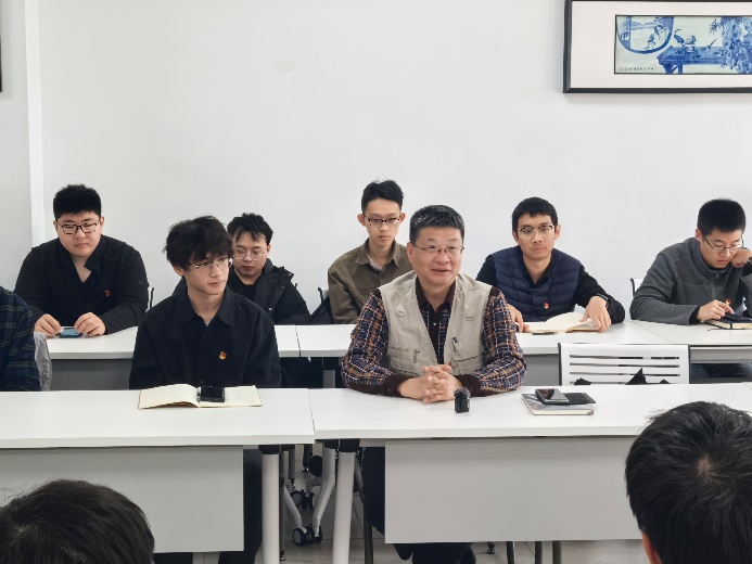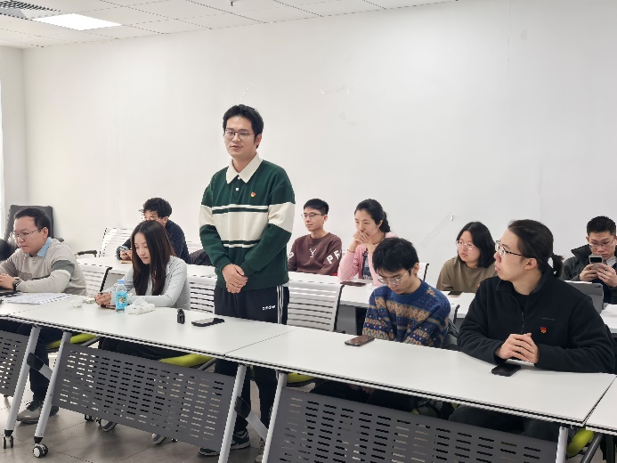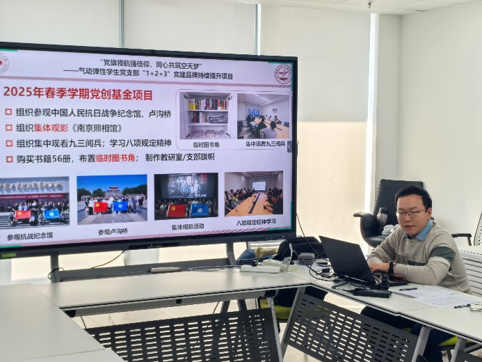 支部书记晁鹏辉代表支委会向支部党员与老师汇报上一学年工作情况。过去一年内,气动弹性员工党支部严格落实“三会一课”制度,组织有条理,工作有成效,打造了校企共建、党史馆参观、抗战纪念馆参观、红色观影等一批颇有意义的党建活动;全学年开展党员大会4次,主题党课及学习日活动9次,集中学习2次;连续获批2024年秋季学期及2025年春季学期校院两级党创基金项目;支部荣获2024年学院“标兵党支部”称号,一位同志获评优秀支部书记、两位同志获评优秀支部委员、四位同志获评优秀党员称号。此外,晁鹏辉同志还总结了支委会在支部工作中存在的不足,并感谢气弹室各位老师对支部建设的支持。