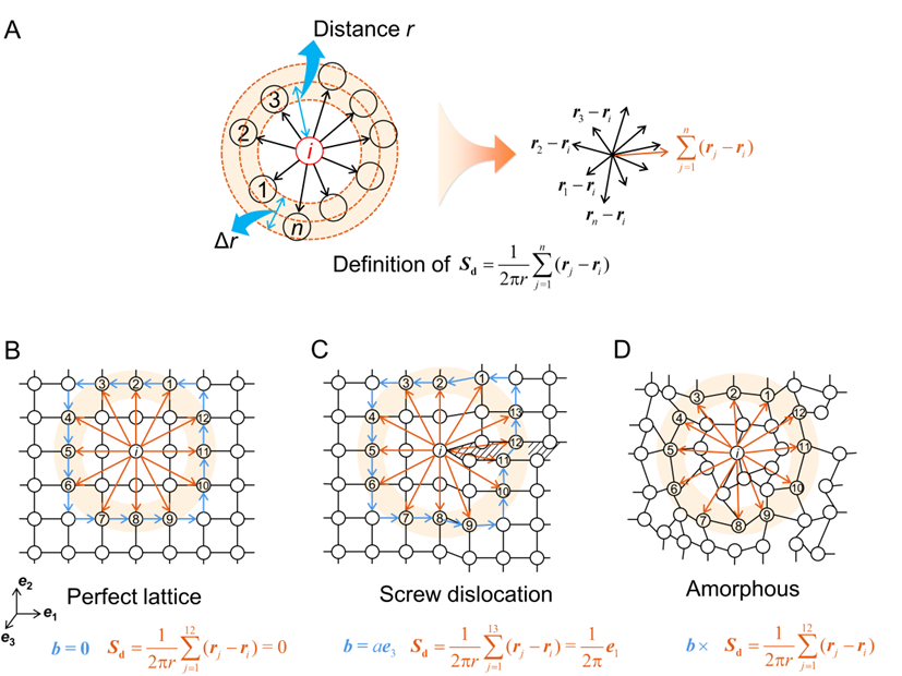 图1. A. Sd(r)的定义示意图。Sd(r)与伯氏矢量在不同原子环境下的对比: B.完美晶体。C.螺位错。D.非晶固体。