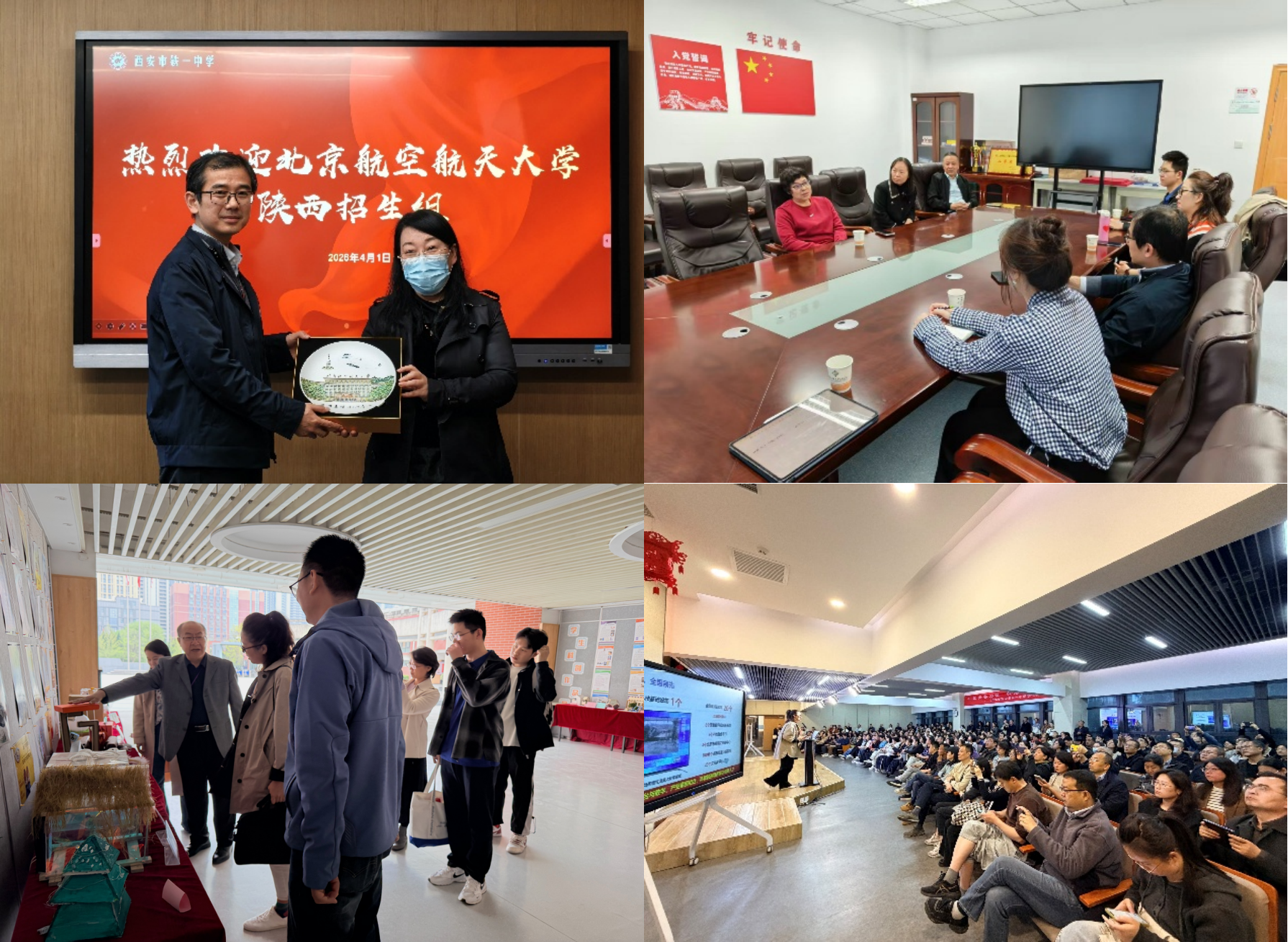 在西安交通大学附属中学,招生组成员与西交附中教务处处长和岩座谈,彭博向近百名家长开展招生宣讲;张华为300余名高中生进行题为《飞机的机翼能够从蜻蜓的翅膀学习到什么?》的科普宣讲,宣讲结束后员工们仍热烈提问,久久不愿离去。