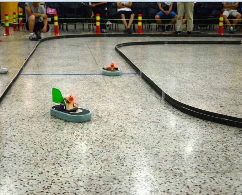随后精彩的决赛拉开帷幕,刘宇、佘宛彧担任比赛现场的讲解员。8组参赛队伍各选出自己的操纵手,亲自操纵航行器比赛。首先展开的是淘汰赛,赛程为三圈,两队中航行速度快者进入下一轮的争霸赛。在四次激烈的竞速之后,第11、15、18以及23组挺进半决赛。半决赛的赛制为五局三胜制,每局赛程五圈,速度快者取胜。首先参与对抗的是许博男(第11组)与李昊辰(第15组),比赛开始后,双方紧咬,许博男一如既往地稳而快,李昊辰也不甘示弱,但一圈之后差距有所拉大,许博男沉着操控,最终以绝对优势击败对手。接下来辛鸿博(第18组)与吴焴凯(第23组)两位操作手开始了竞速,模型在拐弯处各种出人意料的漂移令人印象深刻,两人始终紧咬,难分胜负,不过最后关头,辛鸿博以微弱的优势,率先冲过终点线。最终的冠军争霸赛中,许博男凭借娴熟的操作技能、沉着的应战心态领先辛鸿博摘得冠军,但双方的竞赛也是精彩激烈、扣人心弦。