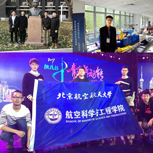 刘思良和杜增智曾参加“未来航空训练营”学习航模制作方法;作为项目“大展弦比可折叠联翼无人机”的作者,栗鸣、杜增智、胡天豪等人创造性地提出一种优势互补的折叠联翼布局方案,从概念到设计图纸到制作再到试飞成功,多次在实验室奋战到凌晨,一点一点在摸索中逐渐完成,项目最终获得“冯如杯”科技竞赛三等奖;栗鸣参与的“共轴倾转旋翼无人机开发与应用”项目更是荣获全国“挑战杯”科技作品竞赛一等奖和“互联网+”老员工创新创业大赛北京赛区一等奖。