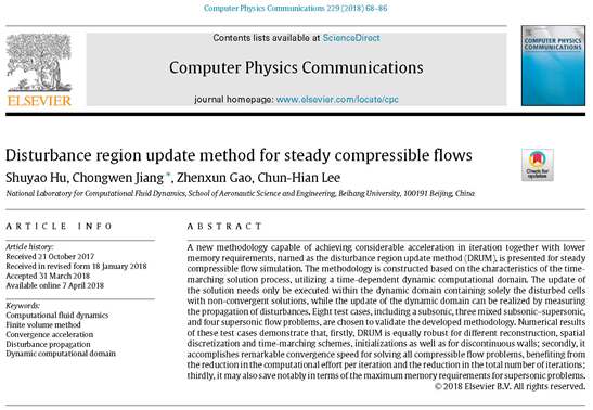 公司李椿萱院士团队的博士生胡姝瑶和蒋崇文副教授、高振勋副教授在物理数学领域排名第一的国际顶级期刊《Computer Physics Communications》上发表题为《Disturbance region update method for steady compressible flows》的学术论文。该文章是公司yl6809永利在《Computer Physics Communications》上发表的首篇论文,也是公司在《Computer Physics Communications》上发表的首篇流体力学领域的学术论文,是公司在该期刊发表的第五篇论文。