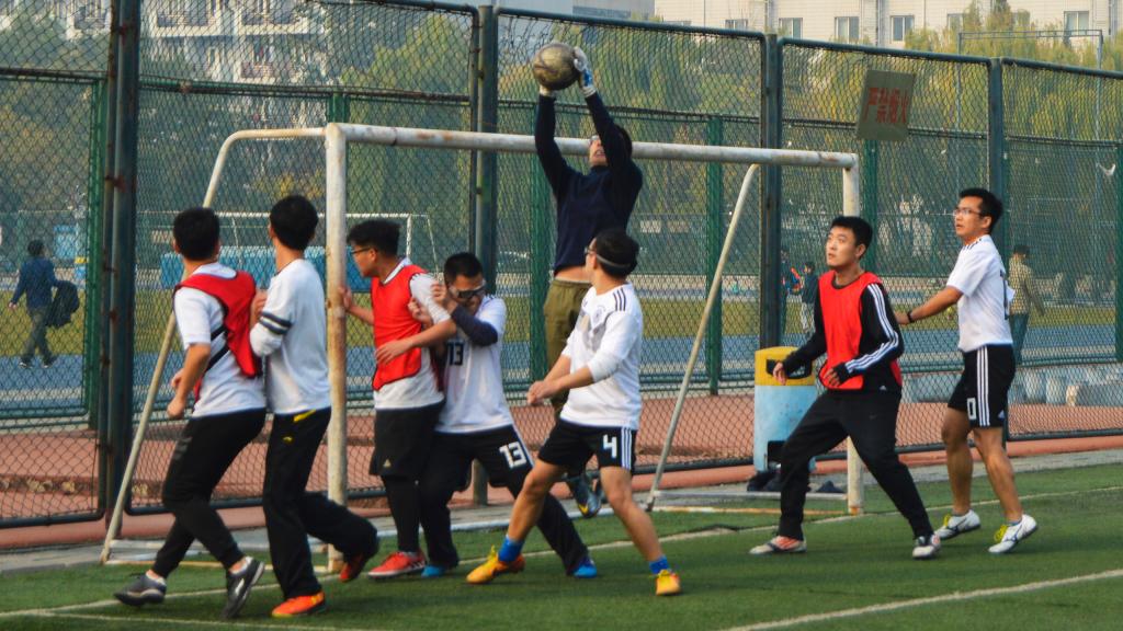 在上半场时间还剩5分钟时,专硕4班获得了一次角球机会。一脚高传中球堪称完美,正落到博士班的禁区之内,博士队后卫全力防守。但是此刻,幸运女神站在了一路拼搏的专硕4班这边,在空中划过优美弧线的足球打在了博士队防守队员身上直接入门,比分改写成2:1。