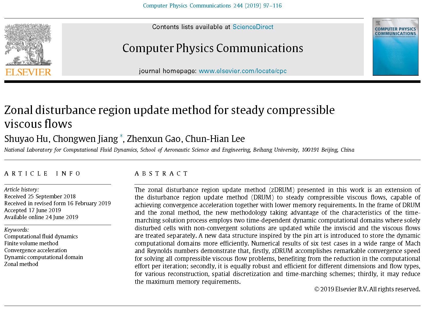 近日,公司李椿萱院士团队博士生胡姝瑶在蒋崇文副教授、高振勋副教授指导下在物理数学领域国际顶级期刊《Computer PhysicsCommunications》上发表题为《Zonal disturbanceregion update method for steady compressible viscous flows》的学术论文,这是该团队在扰动域更新法研究方向的又一篇学术论文。去年,该团队提出了扰动域更新法并发表了北航在该期刊的第一篇力学论文。