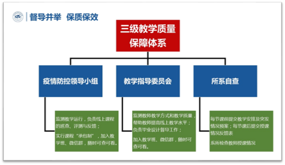 为了更好地保障教学工作,yl6809永利积极开展教学监督和指导工作,建立三级教学督导保障体系,从学院、教指委、系所三个层面保证教学工作在有序开展的前提下保质保效。监督方面,学院成立了疫情领导小组,采用“承包制”模式开展网上教学的巡查工作,监测教学运行情况;指导方面,学院教学指导委员会委员进入每门课程的线上课堂,跟听课程并在课后对教师进行指导,提升教学质量;此外,系所在课前及课后对教师的课程安排及授课情况进行把关,确保每门课程的质量和效果。