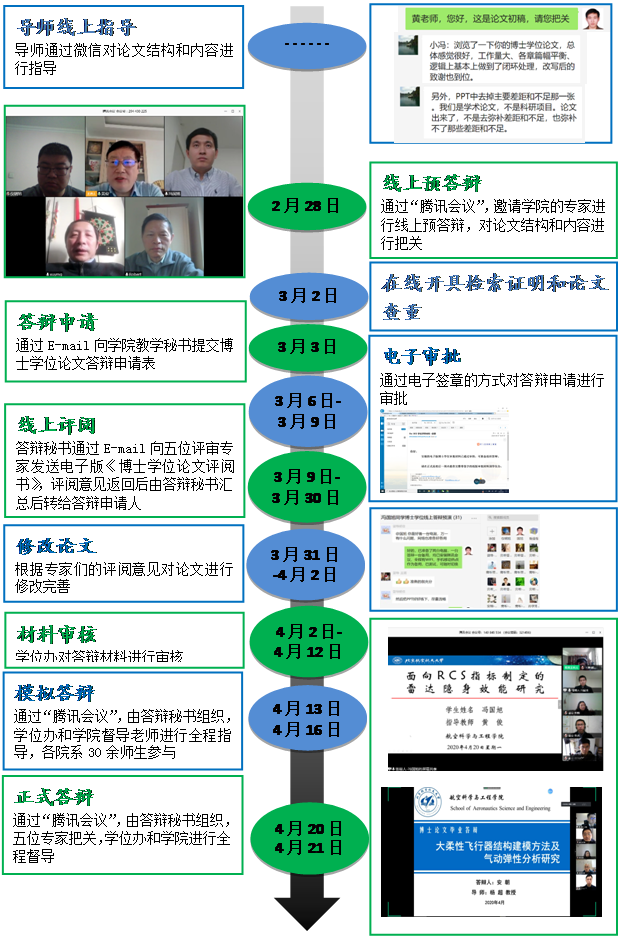 严格把关不放松,流程不减云申请。为保证博士学位论文的质量,在员工提出答辩申请前,首先由各自课题组通过腾讯会议平台组织线上预答辩,邀请领域内专家对论文结构和研究内容进行指导与把关。在专家把关通过后,由员工向图书馆在线提交开具学术论文检索证明和学位论文查重检测申请,再向学院教学秘书提交博士学位论文答辩申请。学位分委会审批通过后,由答辩秘书通过E-mail向评审专家发送电子版《博士学位论文评阅书》,评阅意见返回后由答辩秘书汇总后转给答辩申请人。申请人根据评阅意见对论文进行修改完善,之后再由导师和学位评定分委会审核。审核通过后,由学院教学秘书将答辩审批材料提交校研究生院学位办进行审批。审批通过后,学位办和学院安排督导老师对线上答辩流程进行指导。为进一步保证答辩质量和效果,4月13日和4月16日,由答辩秘书、学院相关负责人和研究生院学位办工作人员共同参与,对两人的学位答辩进行了全流程预演,发现和排除可能存在的问题与不足。