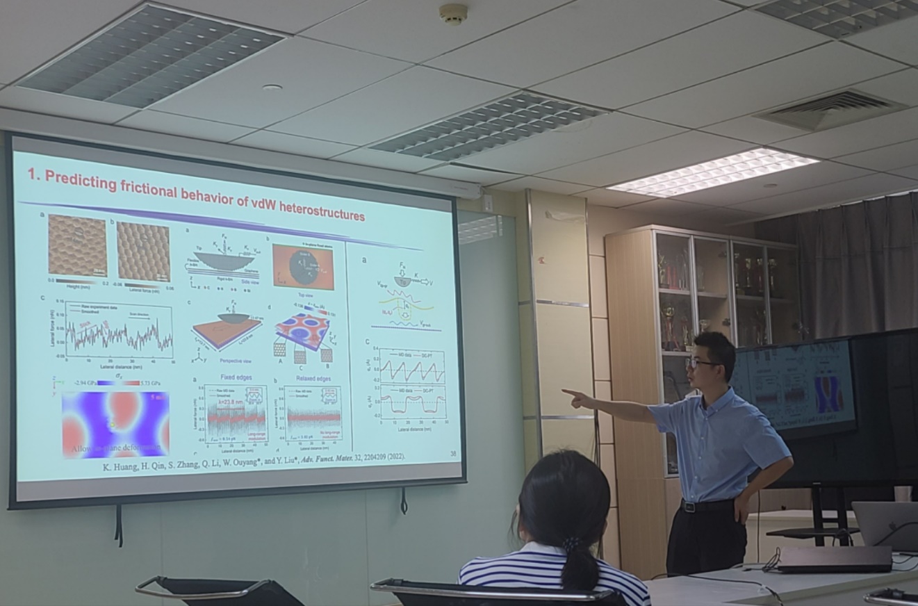 在此背景下,欧阳稳根教授近些年一直致力于发展一套统一的方法来快速构建各类范德华异质结构的准确各向异性层间力场,基本的思路是采用第一原理计算、分子动力学模拟与理论分析、实验测量相结合的技术手段来发展并验证所发展层间力场的准确性,同时将开发的力场写入广泛应用的分子动力学开源软件LAMMPS,为大尺度范德华异质结构提供高效可靠的计算方法,进而系统研究影响其界面力学和物理性质的因素并揭示机理,在此基础上发展相应的理论模型,以期为实验设计具有优异性能的范德华异质结构提供有效指导,促进其在智能器件与制造中的广泛应用。与会师生针对该学术报告提出的范德华异质界面力学领域中的诸多重要力学问题进行了热烈的讨论。
