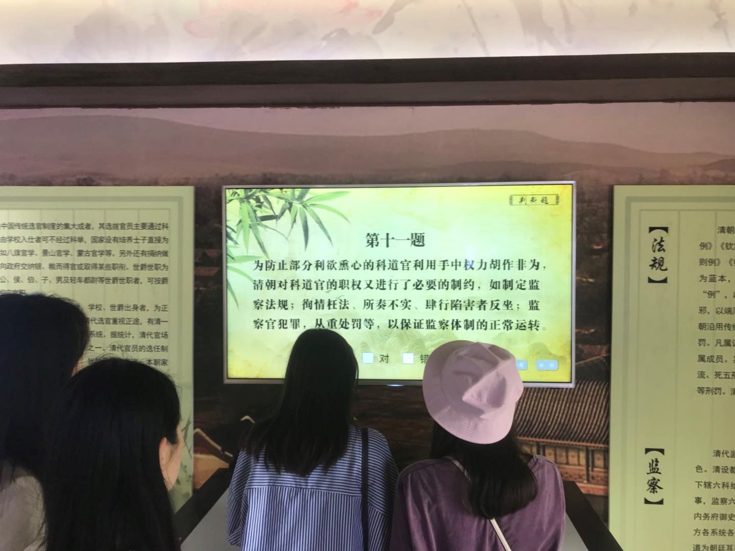同志们按顺序参观了圆明园廉政教育基地----“澄心堂”、“师善堂”、“慎德堂”、“益思堂”四个展室,详细了解了圆明园所记载的清朝治国理政、崇德尚廉、惩贪治吏等历史“活教材”。每个厅内循环播放着关于廉政思想文化内涵、清代贪腐事件腐败问题的成因及处理情况等内容。在慎德堂参观完,支部同志主动参与电子答题,通过这种益智互动加深对廉政历史的了解。清王朝的兴衰史和“三山五园”的变迁史证明,国家的政治、经济和文化发展落后时难免受人欺侮,而廉政是一根不可逾越的底线,是避免根基动摇的根本保证。