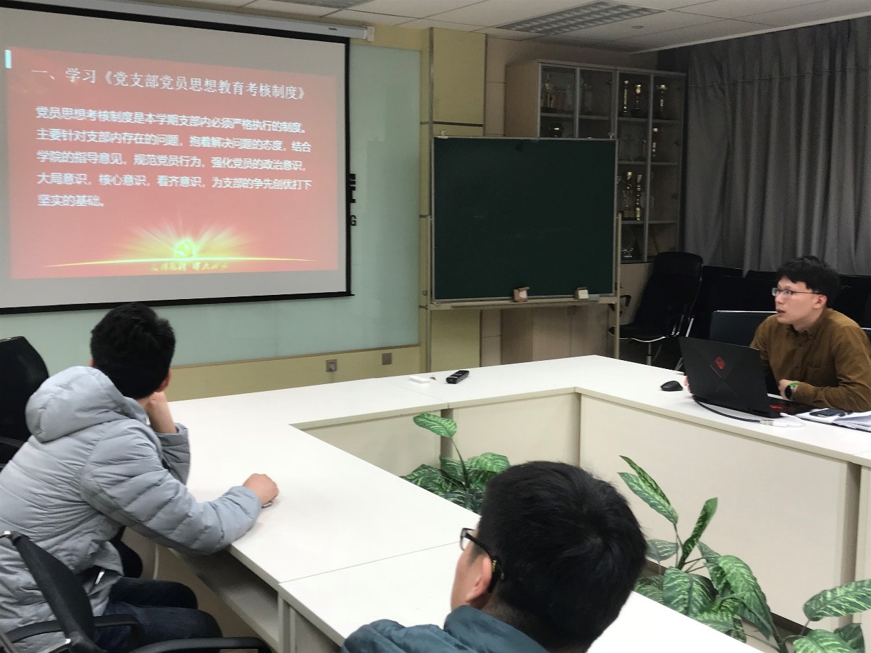 支部书记付子豪同志向支部全体党员介绍了关于本学期支部建设“制度月”的相关精神指示,结合支部特点提出了建立党员学习的考勤和考核制度。