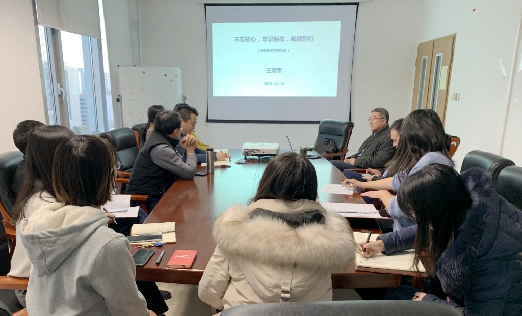 王晋军教授首先带领大家沿着中国共产党带领人民艰苦奋斗的历史,感悟了党为中国人民谋幸福,为中华民族谋复兴的初心和使命。并强调,践行初心使命,就要对党绝对忠诚、勇于担当尽责,习近平新时代中国特色社会主义思想是全党全国人民为实现中华民族伟大复兴而奋斗的行动指南。作为教育工作者要始终以立德树人为根本任务,努力培养社会主义建设者和接班人。最后,王晋军教授针对习近平总书记在全国教育大会上提出的“要把立德树人融入思想道德教育、文化知识教育、社会实践教育各环节,贯穿基础教育、职业教育、高等教育各领域,学科体系、教学体系、教材体系、管理体系要围绕这个目标来设计,教师要围绕这个目标来教,员工要围绕这个目标来学”与机关党支部党员作深入探讨和交流。