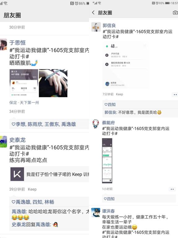 疫情期间,难以出门运动,不少人在网上吐槽自己圆了胖了。除了积极防护,加强运动,强身健体也是我们必不可少的安全保障。为此,1605员工党支部发起了“我运动我健康”居家运动打卡活动,党员同志们以身作则,将自己居家运动的纪录发到朋友圈打卡,带动周围的团员、群众加入到运动健身的热潮中来。党员同志们积极响应,认真运动打卡,年级中的团员受到感召也参与到我们的打卡中来,也让我们倍感欣慰,真切感受到了自己行动的意义。
