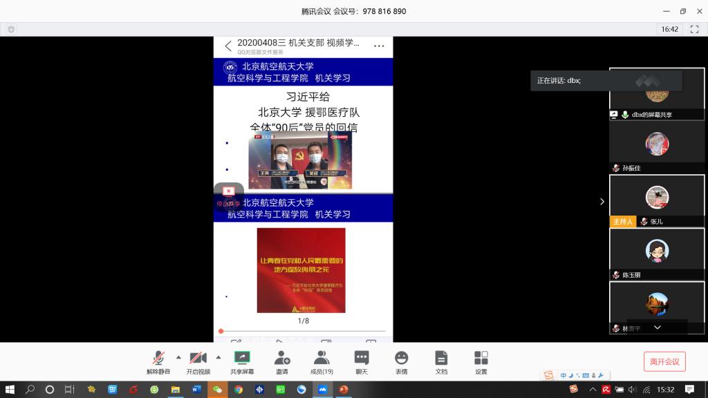(通讯员 孙振佳)4月8日,yl6809永利机关教职工在线开展“学习日”活动,机关全体20名教职工集体学习了习近平总书记给北京大学援鄂医疗队全体“90后”党员的重要回信精神、习近平在二十国集团领导人特别峰会上的重要讲话。