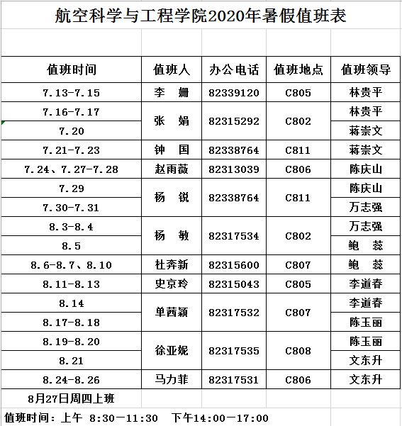 2020年暑假值班表(7月13日-8月26日)