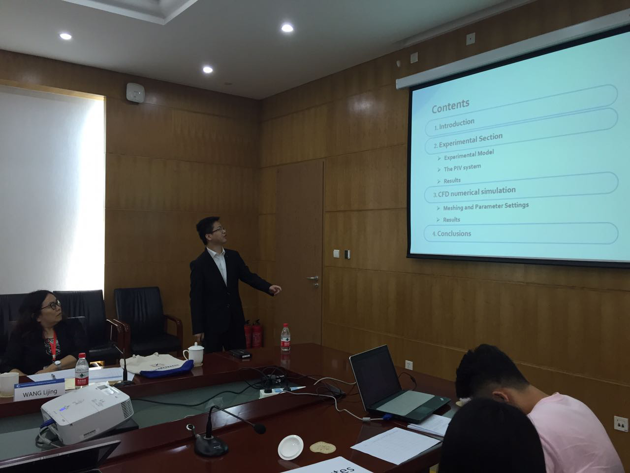 报告内容是:测量洞穴中自然对流的实验研究。在飞机上需要散热的场合,采用自然对流是最简便经济的做法,报告中利用PIV技术测量了一个矩形洞穴中的自然对流流场,并与CFD仿真结果进行了对比。实验和仿真结果均表明,速度在流场中心最大,之后向两边递减,在底部和壁面会出现回流现象。但实验和仿真所得出的最大速度在数值上存在差异,分析认为原因是在仿真时进行了壁面绝热的假设,而实验时外界环境温度较高,无法保证绝热,此外CFD是对三维流场进行仿真,而PIV仅测量了流场的一个截面。在最后,贾志强同学还回答了来自巴基斯坦的Hassan教授对于矩形洞穴与实际座舱差异提出的问题。