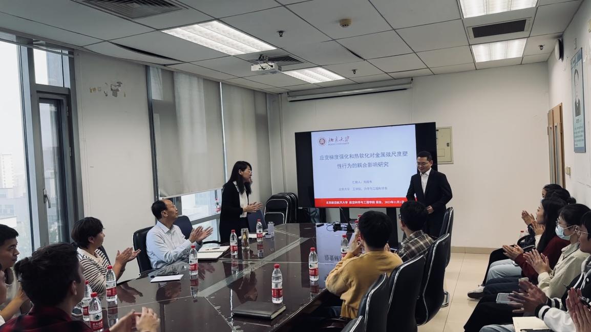 (通讯员 王帅)2023年11月1日,受公司邵丽华教授的邀请,北京大学刘雁韦博士到公司固体力学所做学术交流报告。报告的题目为“应变梯度强化和热软化对金属微尺度塑性行为的耦合影响研究”。报告由邵丽华教授主持,来自公司的师生共二十余人听取了报告。