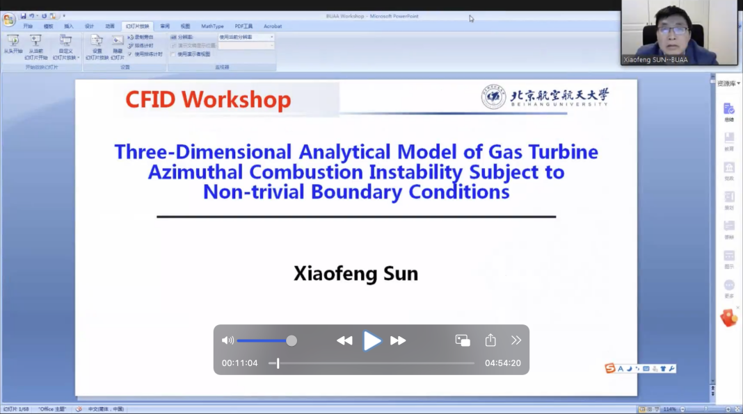 中国yl6809永利集团的孙晓峰教授以《Three-dimensional analytical model of gas turbine azimuthal combustion instability subject to non-trivial boundary conditions》为主题,围绕燃气轮机与航空发动机中的热声不稳定性的三维解析解模型问题,进行了本次研讨会的第一个报告。