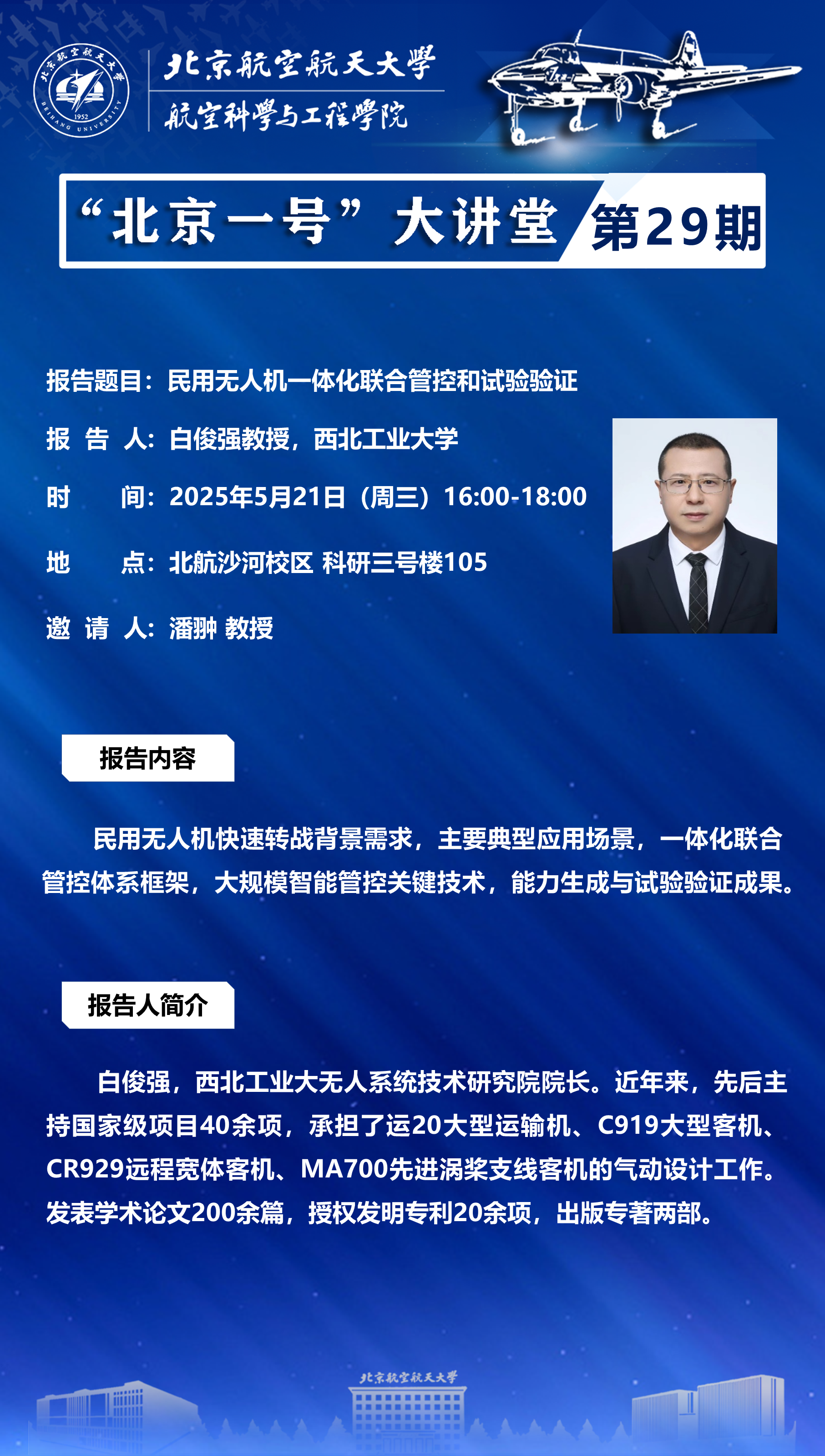 白俊强,西北工业大无人系统技术研究院经理。近年来,先后主持国家级项目40余项,承担了运20大型运输机、C919大型客机、CR929远程宽体客机、MA700先进涡桨支线客机的气动设计工作。发表学术论文200余篇,授权发明专利20余项,出版专著两部。