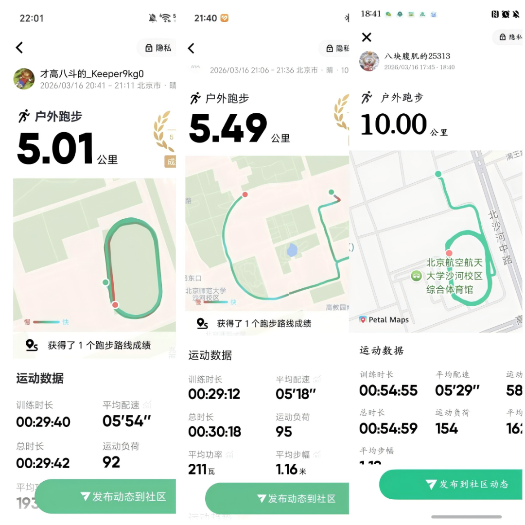 活动期间,众多航院学子积极响应号召,无论是清晨田径场上的整装待发,还是傍晚校园路上的结伴奔跑,都尽显航院青年的昂扬风貌。大家或是独自挑战配速与距离,突破自我极限;或是三两同行,相互鼓励、并肩前行,在奔跑中拉近彼此距离,凝聚同窗情谊。不少同学完成了2公里及以上的打卡目标,用坚持兑现运动承诺。
