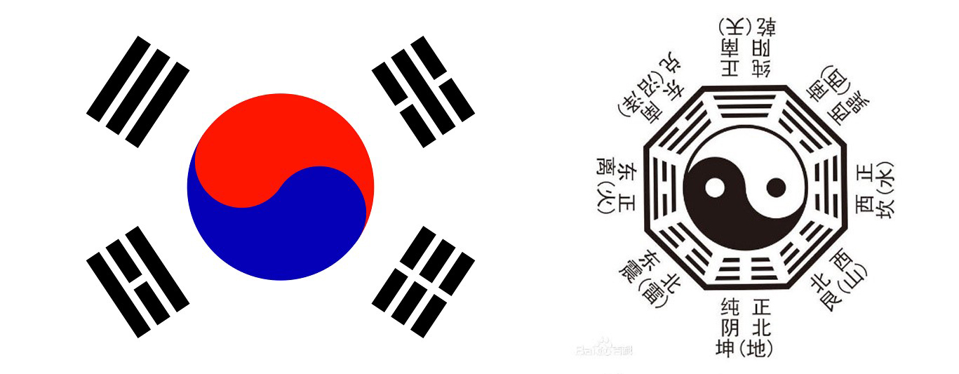韩国国旗仅保留了乾坤离坎四卦,分别对应南北东西,即朱雀玄武青龙白虎四象,与伏羲氏推演的先天八卦图相比,只不过在太极阴阳图的方位上有所调整,因此变得似是而非了。韩国近年来有关传统文化的言论颇具争议,在重新建立自己国家文化的方面,韩国确实显得有些急功近利了。