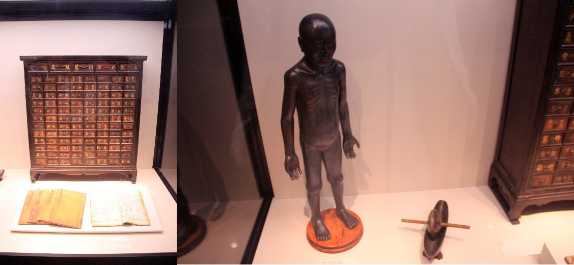 博大精深的中医,药理被韩国吸收并应用。在博物馆里看到显得格外亲切。药柜上写着各类中药名称,人体上也画着经络以及穴位。