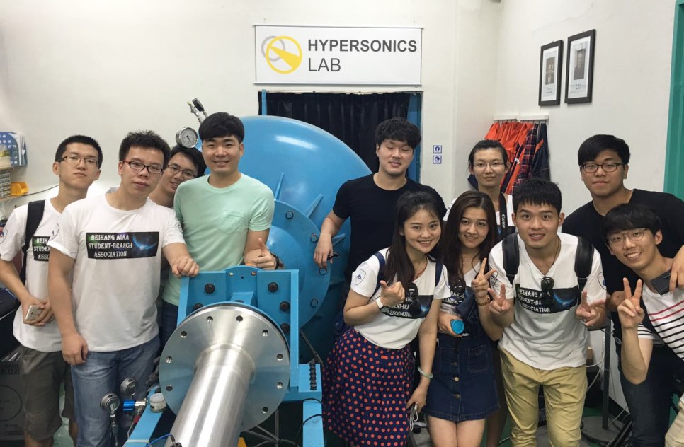 同时,KAIST-AIAA员工分会还安排队员们参观KAIST航模队基地以及各种重点实验室。其中,Seungchan Hong博士等人为队员们介绍了光-电-结构一体化实验室的主要研究课题,详细讲述了无人机智能机翼触觉端口技术、基于FPGA的超声传播成像探伤技术,以及无线超声传播成像用于远程扫描探测结构损伤系统;队员们还参观了空天系统与控制实验室,Seongheon Lee博士介绍了该实验室智能无人机路线规划、导航与制导的技术。Seongheon LEE博士则带队员们参观了高超声速实验室,并详细介绍了产生高超声速气流的实验装置。尖端一流的实验设备,近距离的仪器演示操作,以及博士们细致生动的讲解,使队员们收获颇丰。