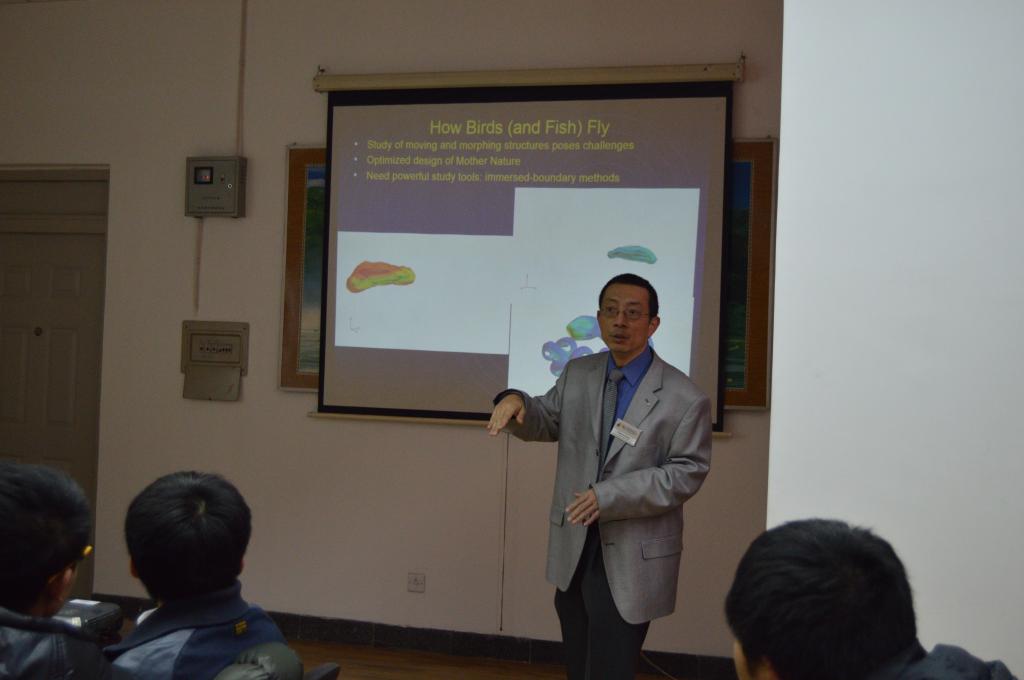2014年12月11日星期四下午15:00,yl6809永利在流体所214会议室举办了一场别开生面的流体力学前沿讲座。此次讲座我们邀请到了堪萨斯大学 航空航天学院教授Zhongquan (Charlie) Zheng为大家介绍了CFD领域中浸没边界方法的研究。