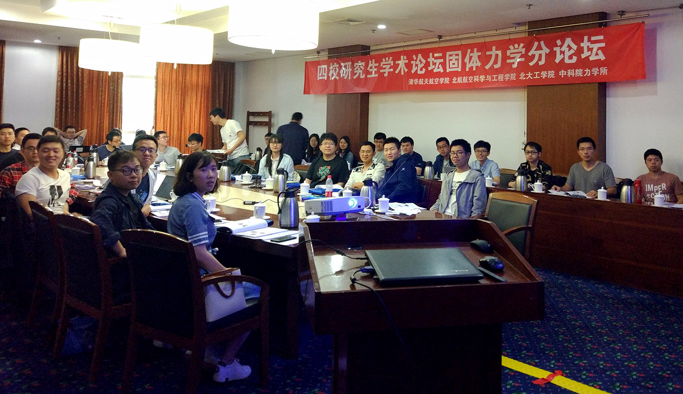 固体力学分论坛规模最大,参会人数最多,共有37名研究生进行了宣讲,其中包括9名来自北航的研究生。讨论从下午1点一直持续到晚上9点,报告涉及金属/合金、复合材料、超材料等多种材料以及模拟、预测、测量、试验等诸多技术。会场氛围异常热烈,受到参会同学的一致好评。