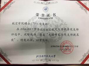 北航yl6809永利硕士17051党支部成立于2017年10月,在习近平新时代中国特色社会主义思想的指引下,支部积极探索新时代研究生党支部工作方法、创新工作思路,独创性地提出“充电放电”“保质提量”的具体办法,切实推进“两学一做”学习教育常态化制度化。支部内党员齐心协力,目前取得yl6809永利“标兵党支部”、北航“先进研究生党支部”提名奖、北航研究生B类党创基金3项荣誉,支部更致力以党建带班建,所联系的SY17052班、SY17053班均获评北航“优秀研究生班集体”一等奖。