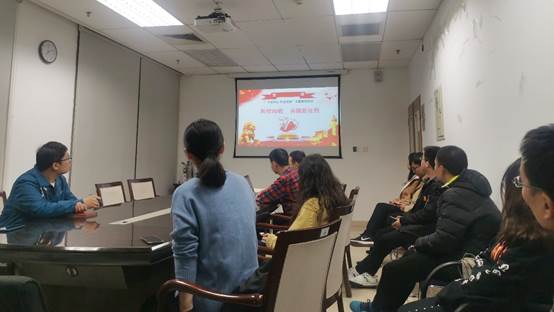 首先,支部书记杨忠伟同志从中华人民共和国成立70年的历史进程、中华人民共和国成立70年伟大奇迹以及“历史是最好的教科书”等方面带领同志们对“辉煌七十载,再踏新征程”主题党课进行了系统学习。学习国史是加强人民思想理论建设的重要环节之一,是继承优良经验和优良传统的需要,更重要的是通过回顾历史从中汲取伟大智慧和力量。通过一段视频,我们回顾了国家从站起来富起来到强起来的艰辛历程。“无限的过去都以现在为归宿,无限的未来都以现在为渊源”——历史是最好的教科书,回望新中国70年的不平凡历程,我们能得到许多宝贵的历史启示。70年来,我们所取得的辉煌成就,不是天上掉下来的,而是全党全国各族人民立足中国国情不断探索、不断奋斗、不断创新的结果。