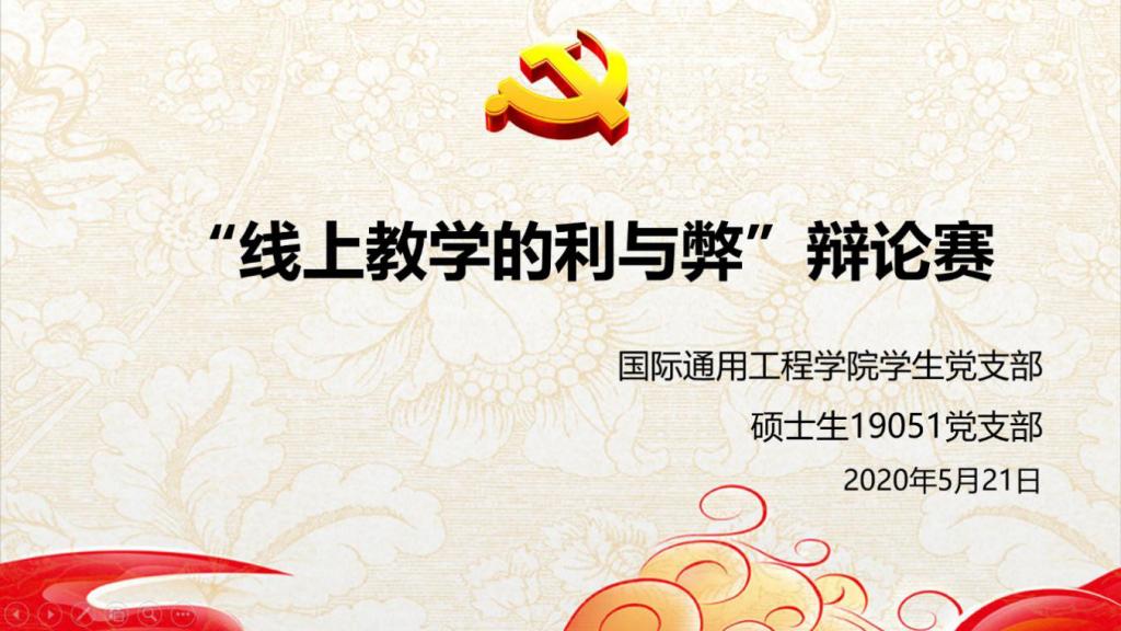 根据“教学相长 携手共进——本研结合的师生良性互动模式探索”党创基金活动项目规划,硕士生19051员工党支部与国际通用工程学院员工党支部于5月21日20:00开展共建活动,以“线上教学究竟利大于弊,还是弊大于利”为题开展辩论活动。来自两名支部的六名辩手参加了本次辩论,国际通用工程学院员工党支部书记孙博扬和硕士19051党支部书记马英超担任评委。