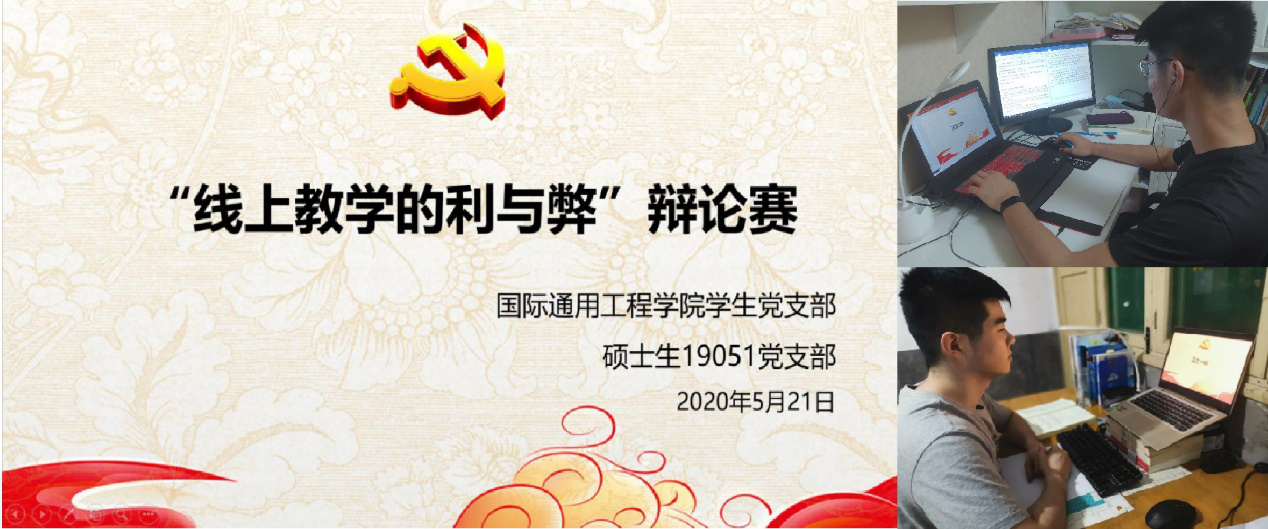 5月21日,硕士生19051员工党支部与国际通用工程学院员工党支部以“线上教学究竟利大于弊,还是弊大于利”为题联合开展线上辩论活动,来自两支部的六名辩手参加了本次辩论。