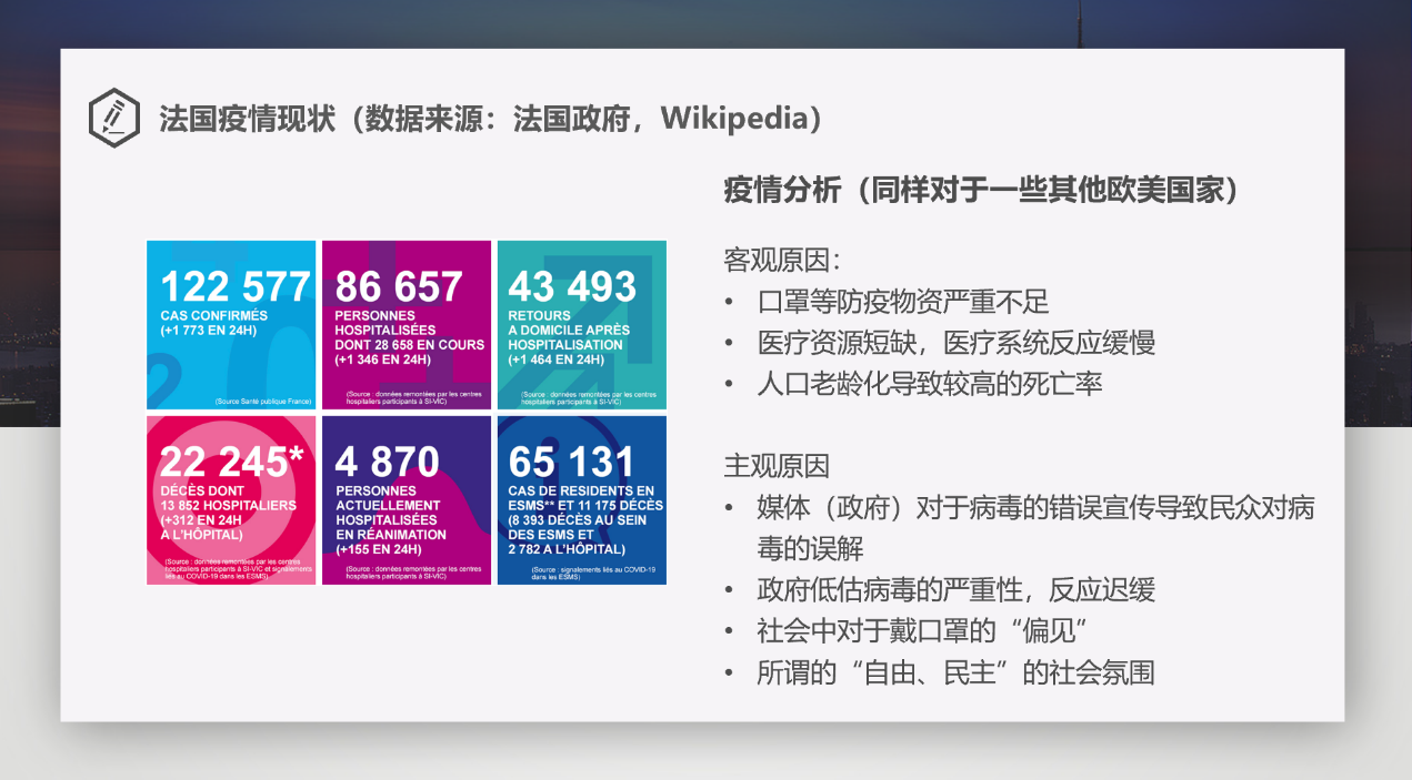 之后,正在法国巴黎交换学习的中法工程师学院2019级研究生党支部党员王泽远同志为大家介绍了法国疫情现状及防控措施。他以一个中国职工的视角,为大家讲述了自己在巴黎疫情期间的生活状态,使大家更加全面地了解了法国疫情期间的公共卫生、出行交通、防疫物资、学校现状以及日常生活等方面的情况。王泽远同志对比了法国和中国的封城措施,从客观和主观两个方面分析了法国政府没有很好地把握住中国为世界抗疫创造的窗口期而导致感染人数激增的原因。最后,王泽远同志与大家分享了自己对疫情背后中法关系的看法,向大家讲述了自己遭受个别法国民众的人身攻击的经历。